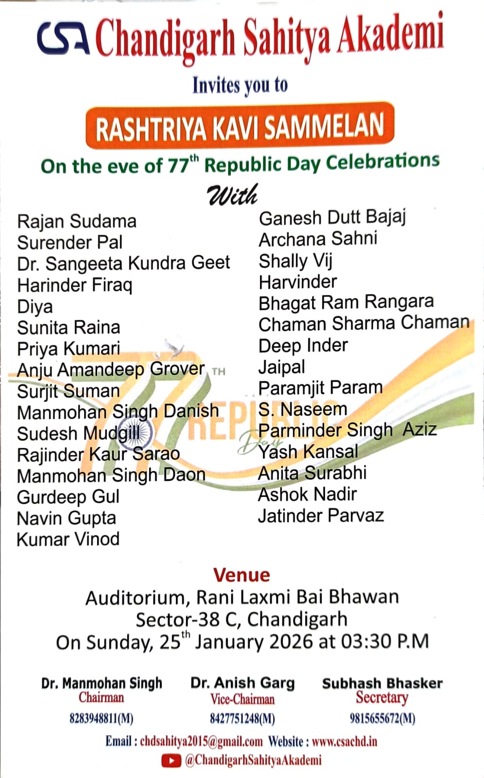 Chandigarh Sahitya Akademi (CSA) works with the mission of nurturing a rich literary culture among the speakers of all five languages like Hindi, Punjabi, English, Urdu and sanskrit in Chandigarh. The writers of these languages have shaped the generations of this city and CSA is playing a vital role in preserving and promoting their legacy while embracing contemporary voices and aspiration of young generations of writers,readers and literary connoisseurs to bridge classical modern and post modern literatures of western and indian/regional traditions. CSA is dynamic centre of literary activities and engagements which organises book discussion symposium and seminars, author interactions, creative writing workshops and literature festivals to promote the interest in literatute among the citizen of Chandigarh , who are known for their rich heritage.